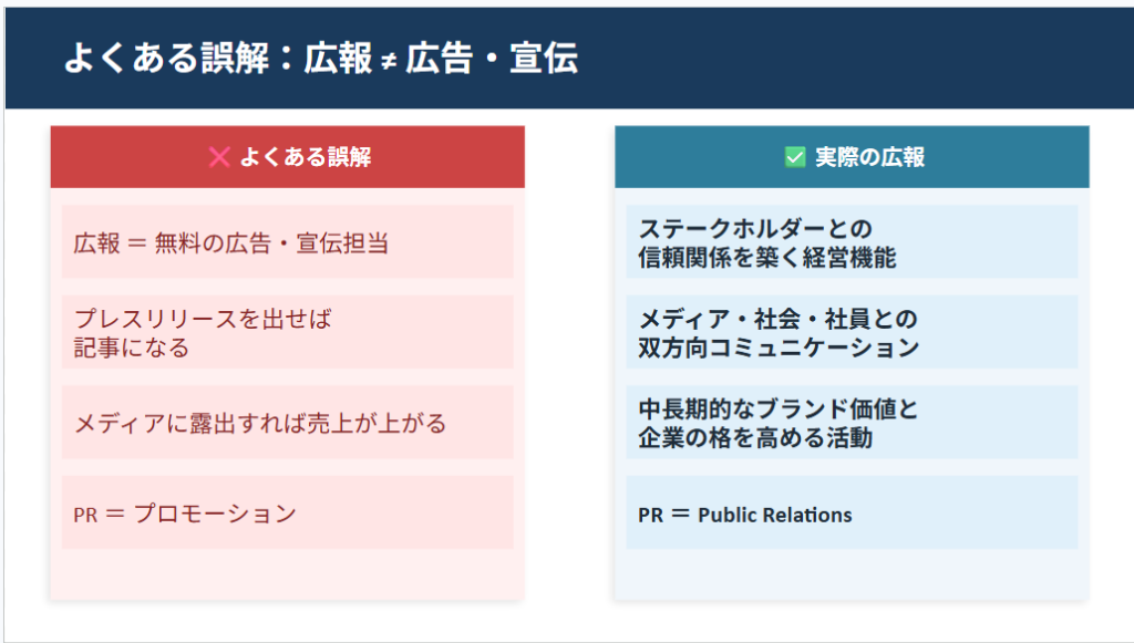 品田さん曰く、PR(広報)は「広告宣伝」ではなく、「多様なステークホルダーとの双方向コミュニケーションを通じ、社会的に望ましい環境を構築・維持する経営活動」です。メディア露出による短期的な売上向上を狙うものではなく、中長期的なブランド価値を高める活動として理解しておく必要があります。