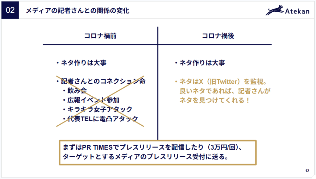 そして、冒頭の問い(「プレスリリースを出してメディアに載りたい。認知を取りたい」)については、コロナ禍以降で大きな変化があったそうです。それは、メディア(記者)と企業の関係性が変化して、「情報を発信していれば、メディアの記者が見つけてくれる機会が増えた」らしいのです。