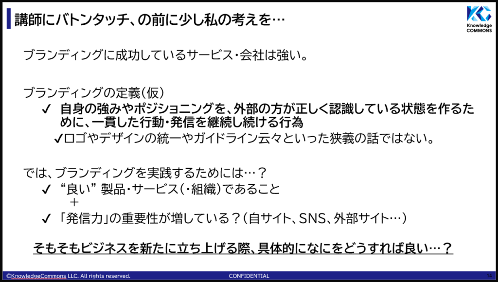 勉強会の冒頭にissueをひとつ投げかけて見たのですが、品田さん・神藏さんによって「価値の言語化を経てから、発信!」という具体的なアドバイスをいただけたのが大きな収穫です。
